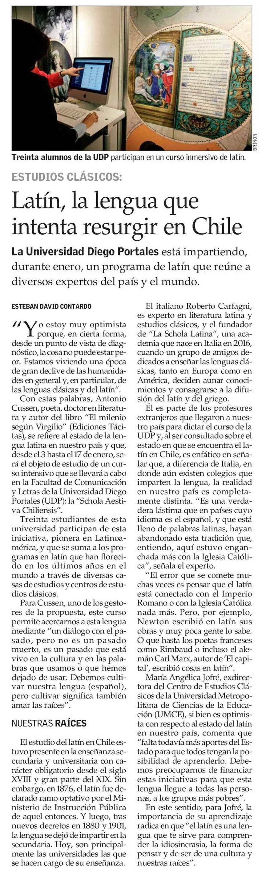 «Es una verdadera lástima que en países cuyo idioma es el español, y que está lleno de palabras latinas, hayan abandonado esta tradición que, entiendo, aquí estuvo enganchada más con la Iglesia Católica. El error que se comete muchas veces es pensar que el latín está conectado con el Imperio Romano o con la Iglesia Católica nada más. Pero, por ejemplo, Newton escribió en latín sus obras y muy poca gente lo sabe. O que hasta los poetas franceses como Rimbaud o incluso el alemán Carl Marx, escribió cosas en latín», plantea Roberto Carfagni, experto en literatura latina y estudios clásicos, y académico italiano que participa en la escuela de latín UDP.